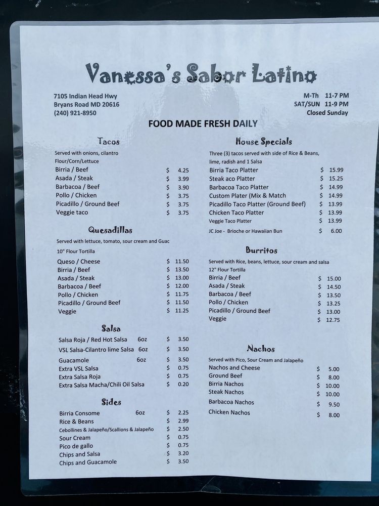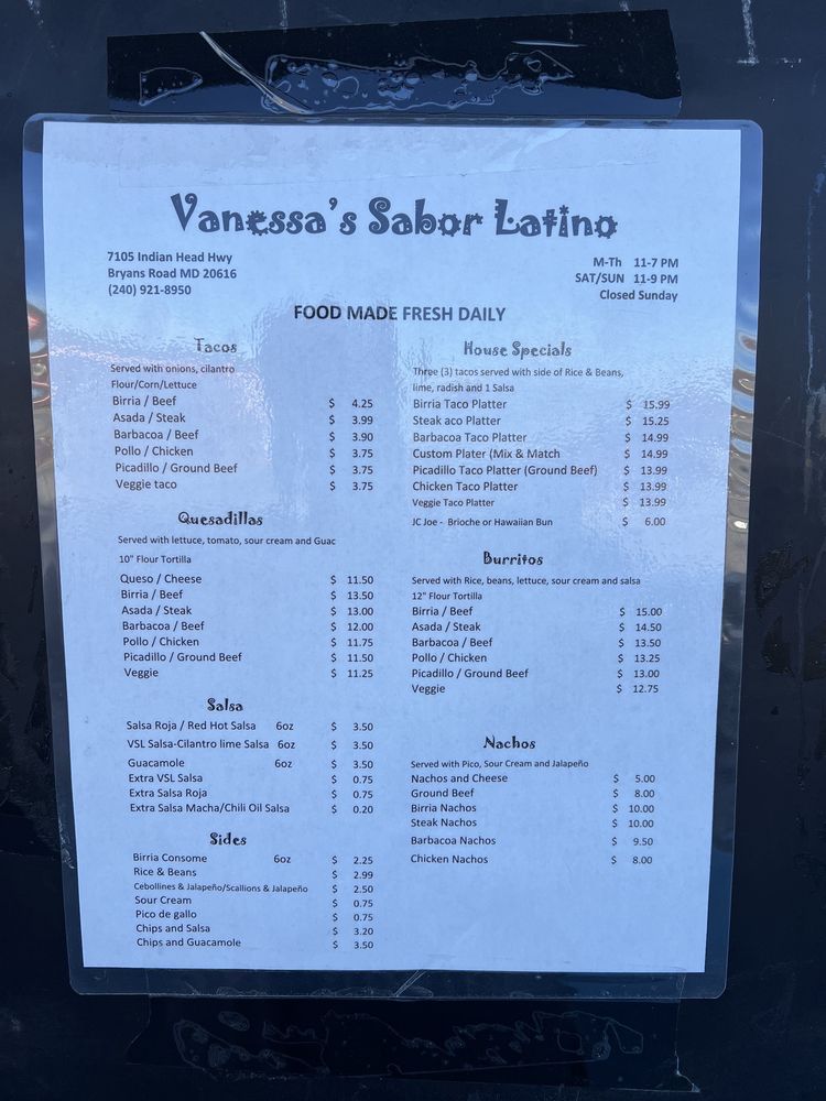 Vanessa’s Sabor Latino is a taco and salad joint located in Bryans Road, MD offering a delightful fusion of Latin flavors. Customers rave about the exceptional service and delicious food, with specialties like birria tacos and a tantalizing cilantro lime salsa that is versatile for various dishes. The ambiance is perfect for outdoor dining, making it a must-visit spot for a flavorful meal. Despite some feedback on pricing, the overall consensus is overwhelmingly positive, with patrons returning regularly for the tasty dishes and friendly staff. With a diverse menu and top-notch service, Vanessa’s Sabor Latino is a hidden gem worth exploring for a truly satisfying dining experience.